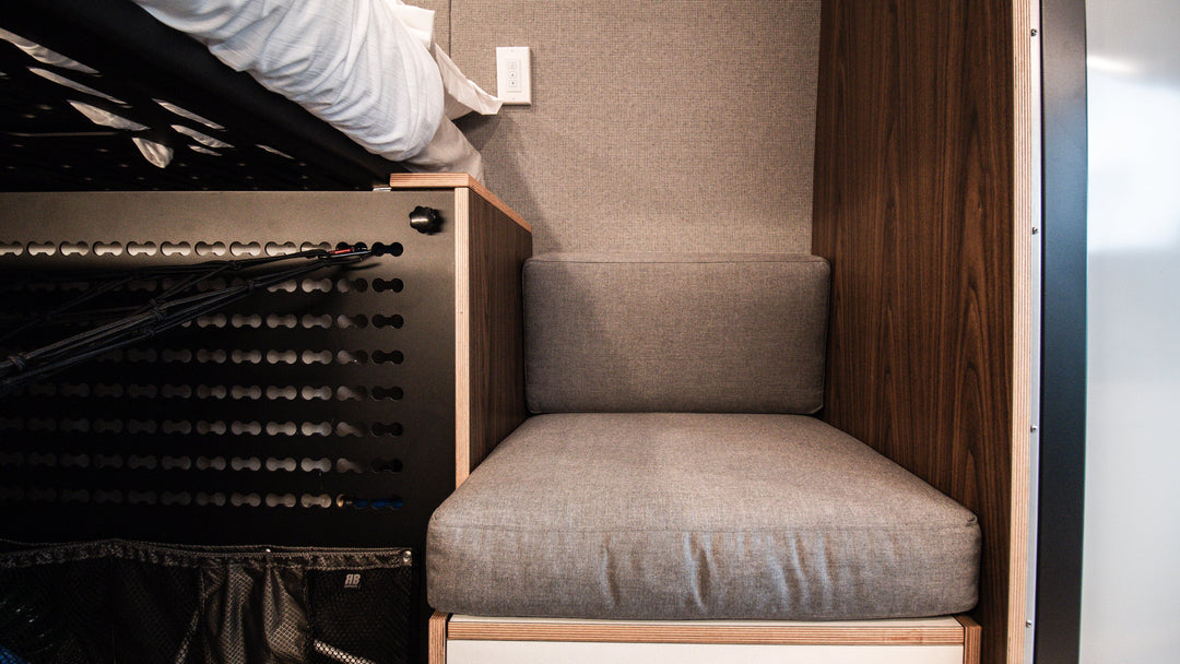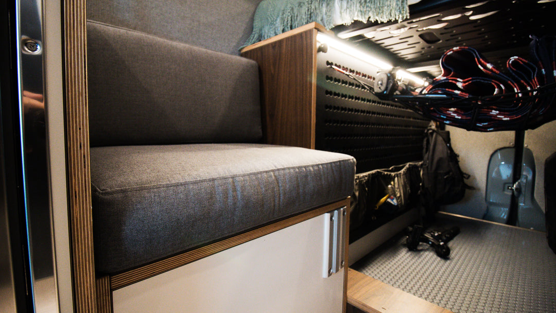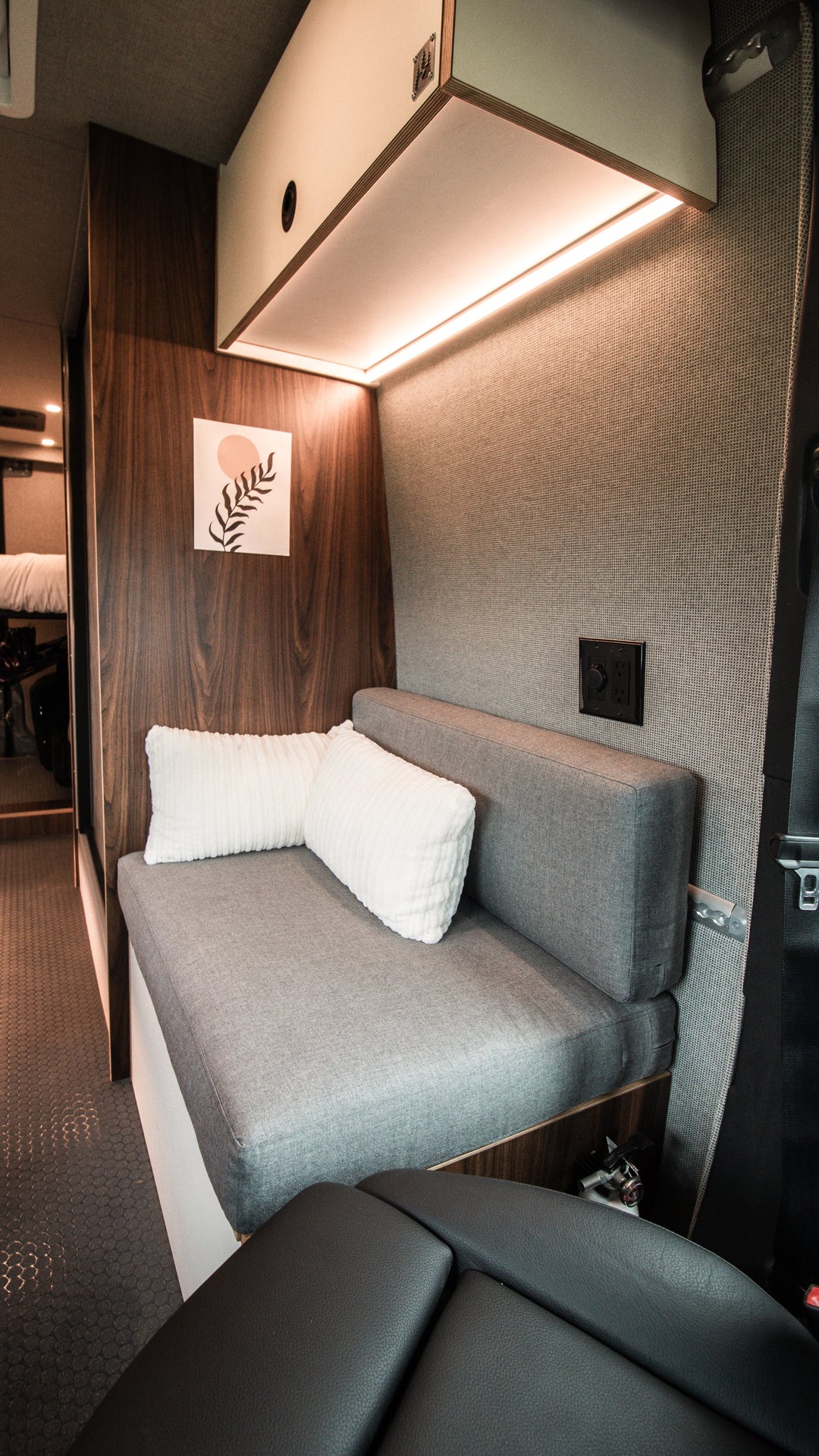 Living and seating areas are designed for relaxation, with a Flatline Van Co panel bed and mattress, Flarespace sleep-sideways flares, dinette and bench seating, Rolef Bug Screens, and an additional JMG swivel captain's chair. The galley is a nomadic chefs dream, equipped with an induction cooktop, microwave, ample cabinetry space, laminate Baltic birch cabinetry, a Rubio Monocoat finish, walnut countertops, and a Lagun table for versatile additional counterspace.