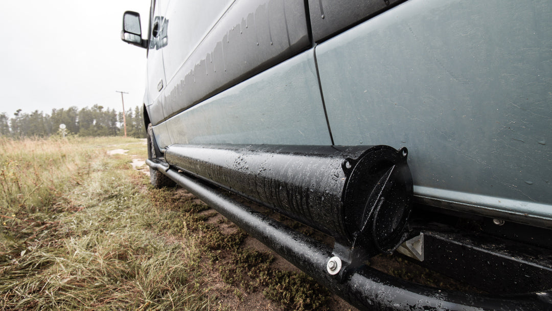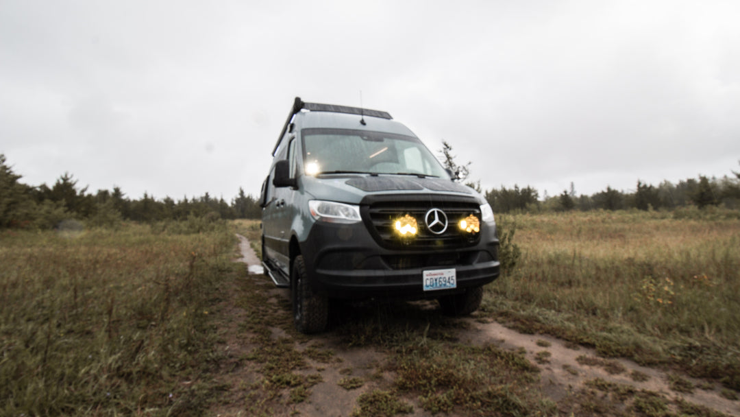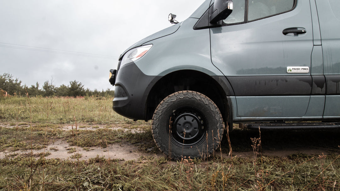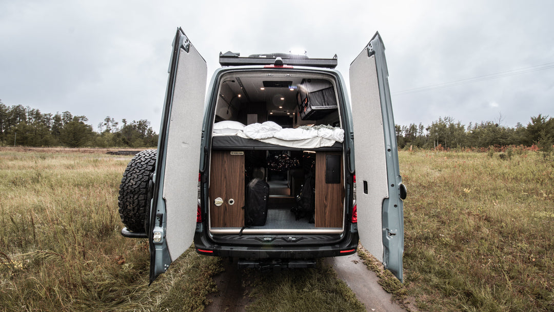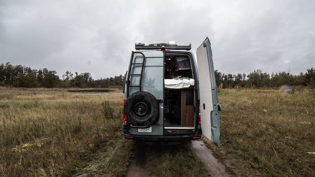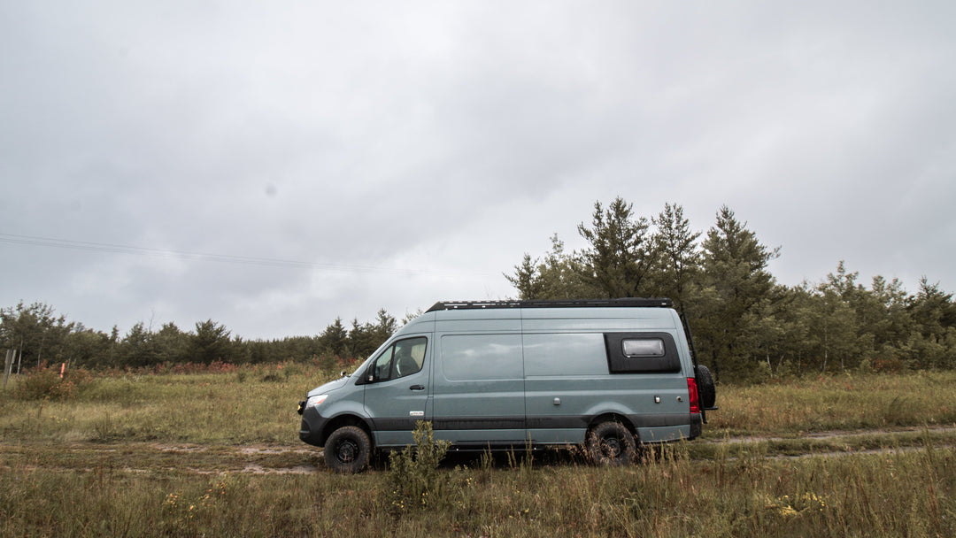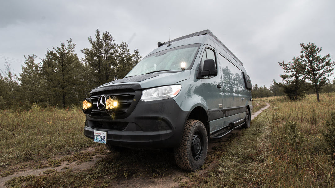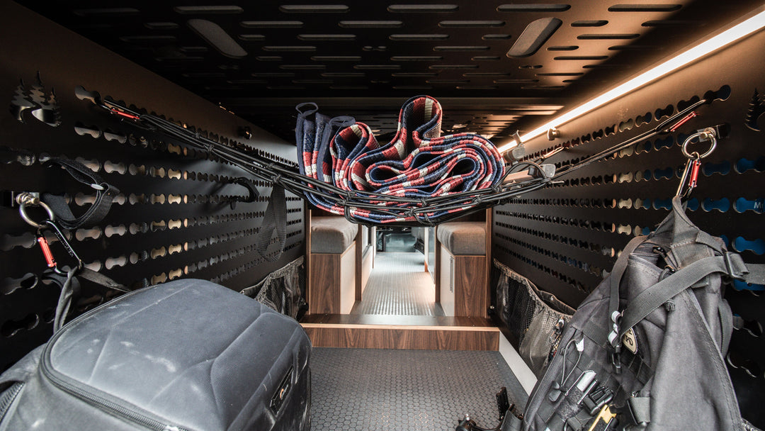 Additional utility features include an overhead cab shelf, suspension upgrade, rear tire carrier, Flatline Van Co roof rack, exterior lighting package, and Backland Expedition rock slider steps.