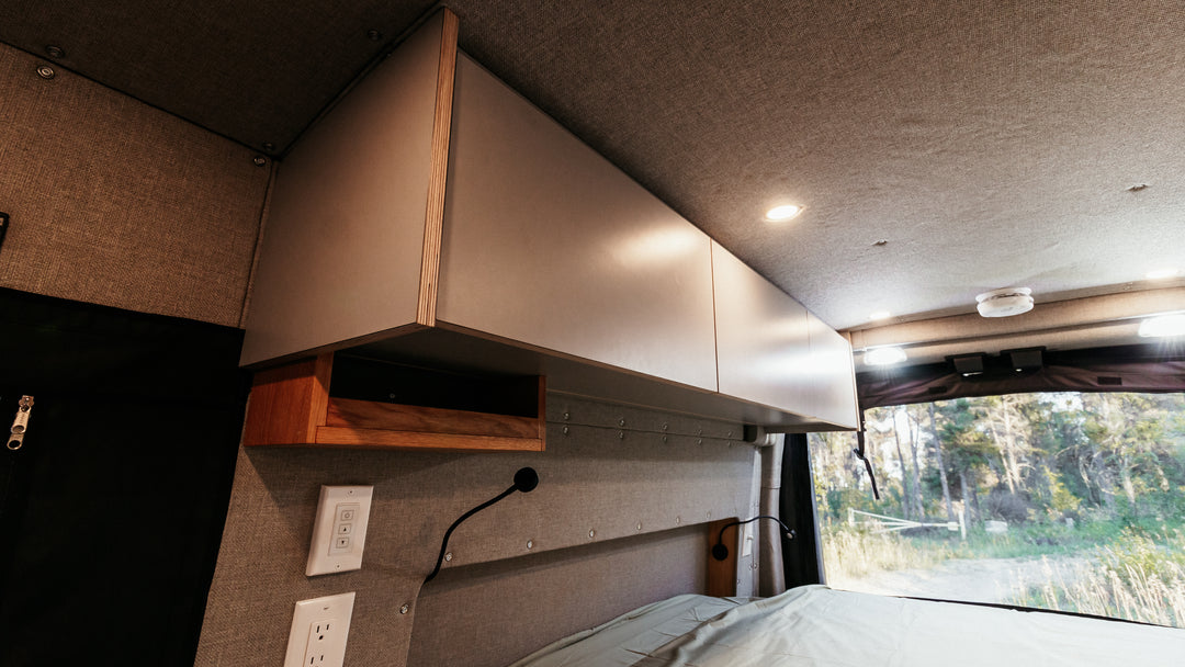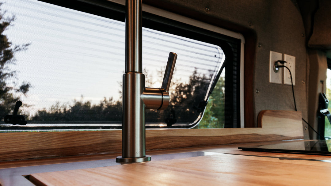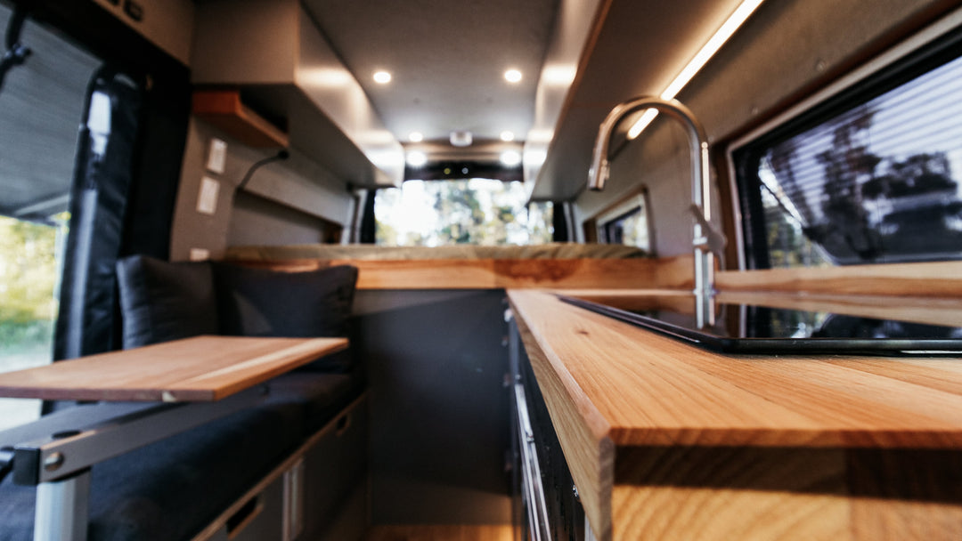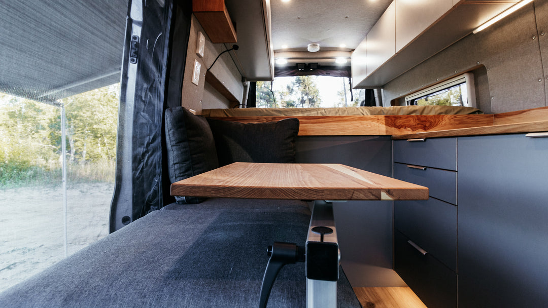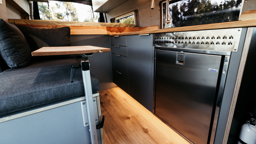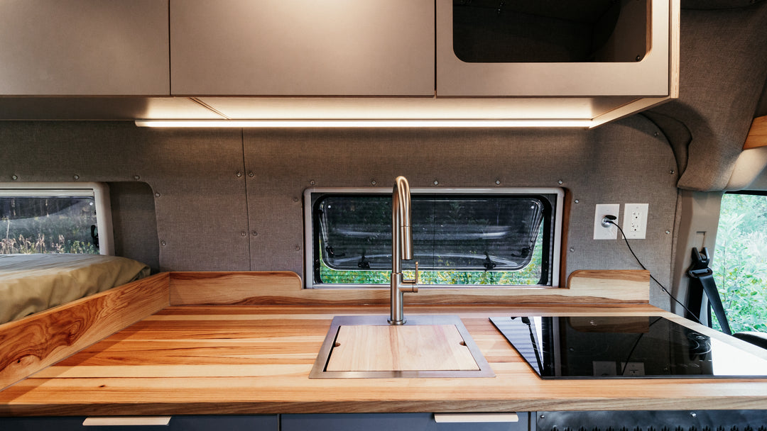 The moody undertones of the lower cabinets mix perfectly with the hardwood and white upper cabinets. This van feels like a home away from home and a perfect way to get you to the trails and the most enjoyable way to spend a rainy day indoors.